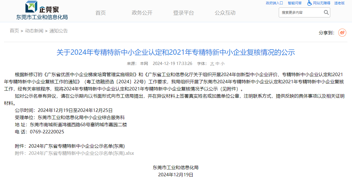 近日,东莞市工业和信息化局发布了《关于2024年专精特新中小企业认定和2021年专精特新中小企业复核情况的公示》,乐玩lewin高能顺利通过广东省专精特新中小企业复核。